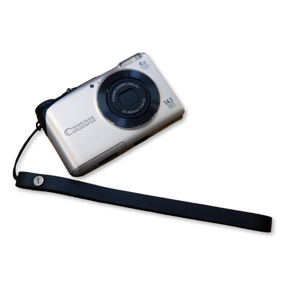 コンパクトデジタルカメラにシンプルなデザインのカメラハンドストラップです。