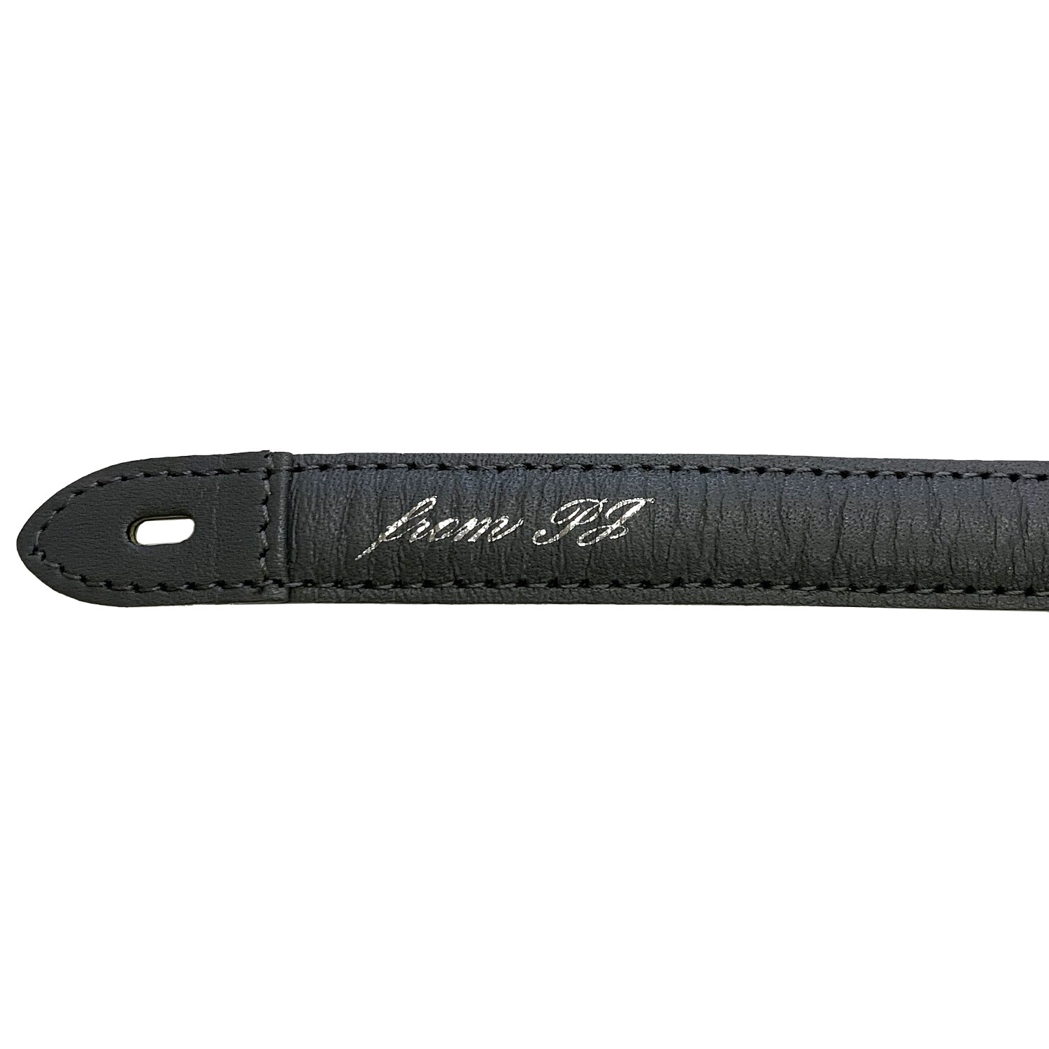 ストラップ側の取りつけ穴部寸法 幅3ミリ×長さ7ミリ弱の楕円形、穴周辺部の皮革厚み1ミリ強(折返し重ねた場合の